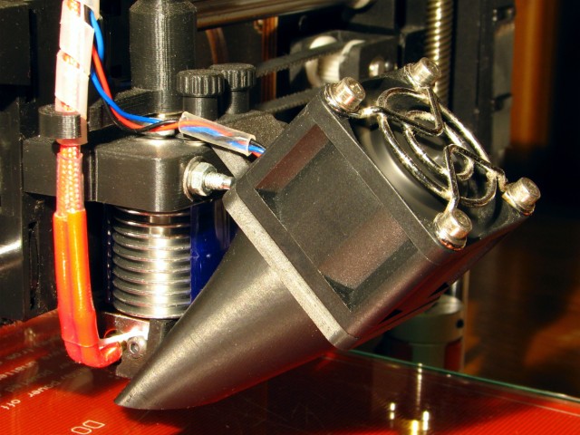 This upgrade is in two parts: a 40mm mini PWM cooling fan wired to the mainboard to enable sofware controlled speed regulation and a cooling duct designed to blow air around the part.