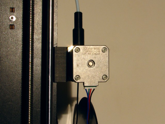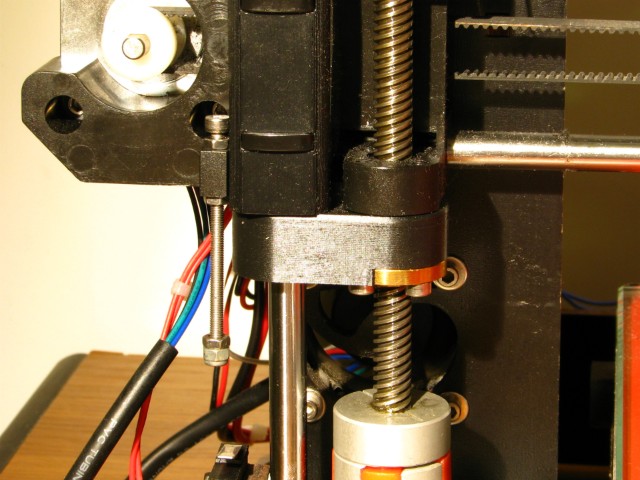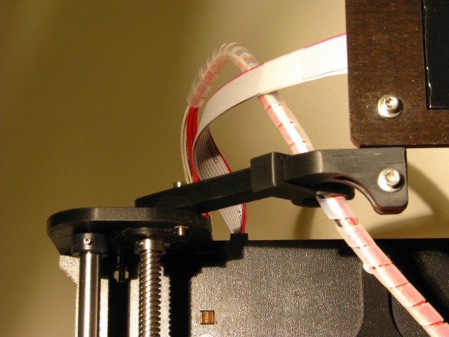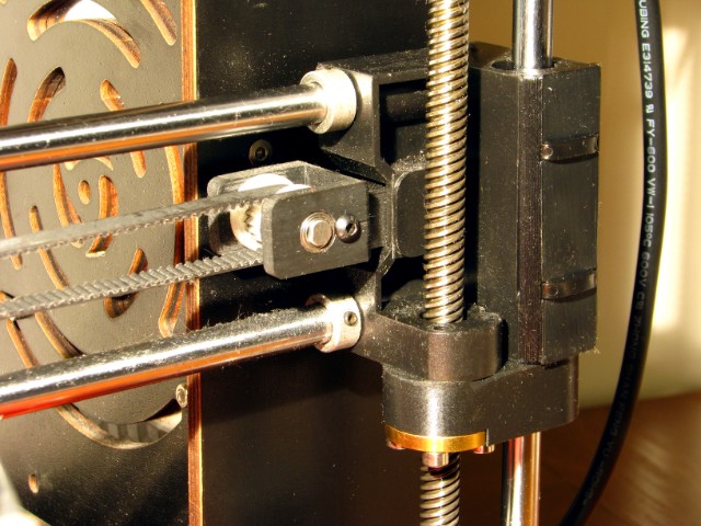 to bracket to withstand the increased tension. The photograph on the left also shows the X-axis idler carriage resting on the Z-axis anti-wobble coupling , effectively decoupling the X-axis from the Z-axis.