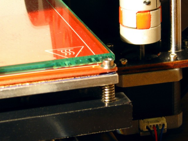 sheet, the heating PCB (turned upside down to have the heating track on top), a 2mm cork sheet and a 6mm aluminium plate. The bed is mounted on springs secured with Allen screws, adjustable from the top. Note also the stiffening