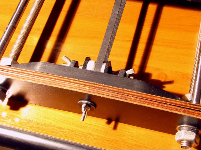 The printer structure frame is made out of plywood which buckles easily under tension. The idler pulley of the Y-axis toothed belt is mounted to the centre of the front plate while the Y-axis