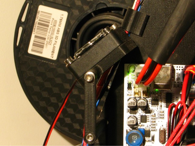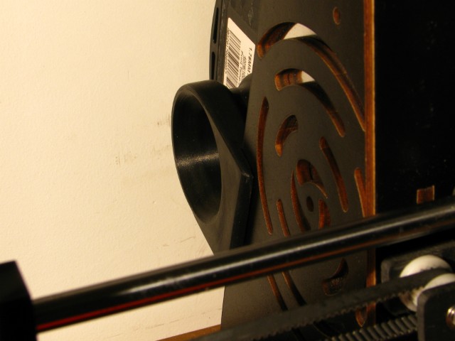 The printer out of the box came with a stand-alone reel holder. The original spindle was used in conjunction with a newly designed bracket to clip onto the structure behind the power supply.