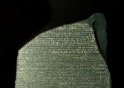 army. It is inscribed with three versions of a decree issued at Memphis, Egypt in 196 BC during the Ptolemaic dynasty on behalf of King Ptolemy V. The top and middle texts are in Ancient Egyptian using hieroglyphic script and Demotic script respectively, while the bottom is in Ancient Greek. As the decree has only minor differences between the three versions,